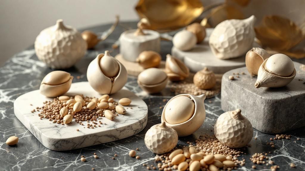 - Ceramic cocoa pods and bronze magnolia seeds tell stories with clarity and assurance